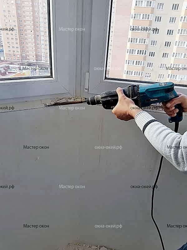 - Подготовка оконного проема: выравнивание поверхности, срезание Pin-Up в боковых стенках для монтажа, уборка мусора.